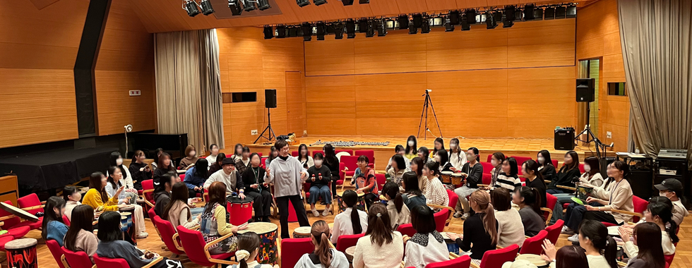 午前中は、音楽館のホールで演奏学科・応用音楽学科の学内演奏Ⅰ~Ⅲ履修生約80名の学生と先生方が集まりました。音楽部合同演奏として、DC体験を中心としたセミナーを行いました。今回は、関西在住の当法人地域サポーターの方々も参加し、前年よりも心強いセッションとなりました。後半、アーサーリアン方式のリズムチャーチと呼ばれるトーンチャイムへの移行セッション体験も行いました。